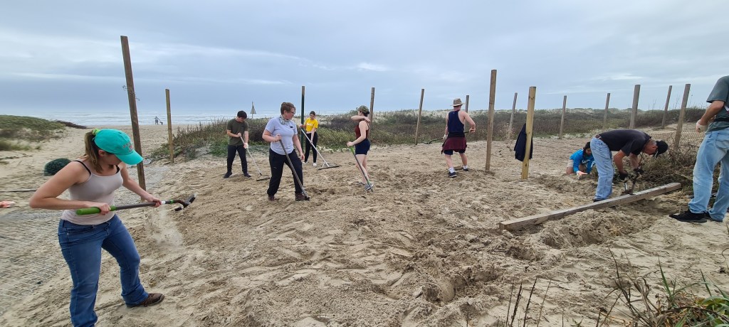 Spring Break Volunteer Trip to Sea Turtle Inc.: Students from Emporia State and Pittsburg State Universities led by Dr. Rachel Bowes volunteer their spring break to work with the conservation team at Sea Turtle Inc. (https://seaturtleinc.org/) to build a sea turtle beach hatchery in South Padre Island, TX. Hundreds of turtle nests are lost due to crushing by cars on the beaches of TX each year. These beach hatcheries are vital in protecting nests and helping the population of Kemps Ridley and Green Sea Turtles bounce back in TX. Students have a hugely impactful experience. In addition to seeing many species of sea turtles up close and personal, we were also able to go on a dolphin boat tour (where we got to see a newborn baby bottlenose dolphin!), explore the coastal wetlands, see many migrating bird species, hike in the palm forests along the Rio Grande, and eat some fantastic seafood.